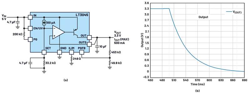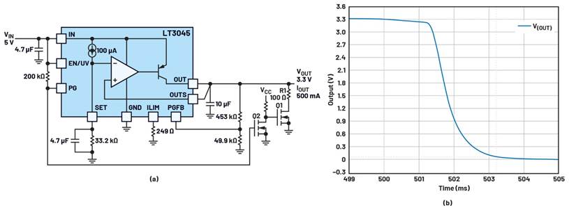 Figure 5. (a) Using the PGOOD signal of the LT3045 to trigger external MOSFETs as a discharge circuit and (b) its discharge time of 3.2 ms at