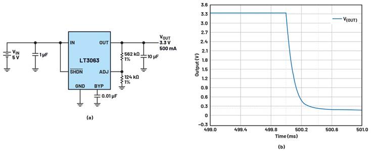 Figure 6. (a) LT3063 example circuit and (b) its discharge time of 0.5 ms at 10 kΩ output load.