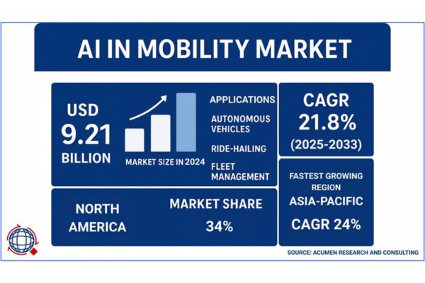 According to Acumen Research And Consulting, the global AI in Mobility Market is projected to surge from a value of USD 9.21 billion in 2024 to an astonishing USD 53.75 billion by 2033, achieving a robust compound annual growth rate (CAGR) of 21.8% during the forecast period. This remarkable growth underscores expanding investments into autonomous vehicles, smart transportation infrastructure, ride-sharing, and fleet management.