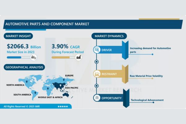 The global Automotive Parts and Components Market is projected to grow from approximately USD 2066.3 billion in 2023 to USD 2844.52 billion by 2032, expanding at a CAGR of 3.9% during the forecast period. Growth is supported by sustained global vehicle production, rising aftermarket demand, and increasing integration of advanced electronic and safety components.