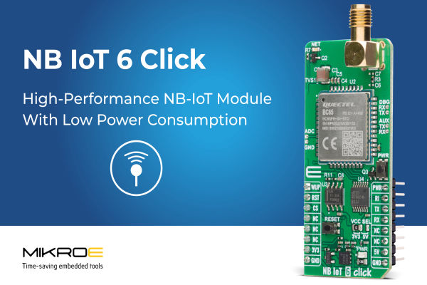 NB IoT 6 Click is a compact add-on development board that delivers provides reliable narrowband IoT connectivity for embedded applications. This new Click board from MIKROE, the embedded solutions company that dramatically cuts development time by providing innovative hardware and software products based on proven standards, is created around the BC65, a high-performance multi-band NB-IoT module from Quectel with ultra-low power consumption and which is compliant with 3GPP Release 13 and Release 14 standards.