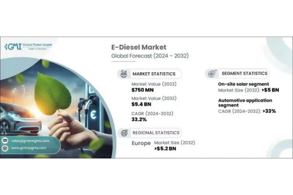 The E-Diesel Market was valued at USD 750 million in 2023 and is projected to grow at a CAGR of 33.2% from 2024-2032. This surge is primarily fueled by global environmental regulations and an increasing demand for fuel efficiency. As both the transportation and industrial sectors push for better fuel efficiency and lower emissions, e-diesel emerges as a prime candidate. With energy density and performance akin to conventional diesel, e-diesel becomes especially appealing for applications prioritizing efficiency and environmental considerations. Global environmental regulations and climate policies are propelling the e-diesel market forward.