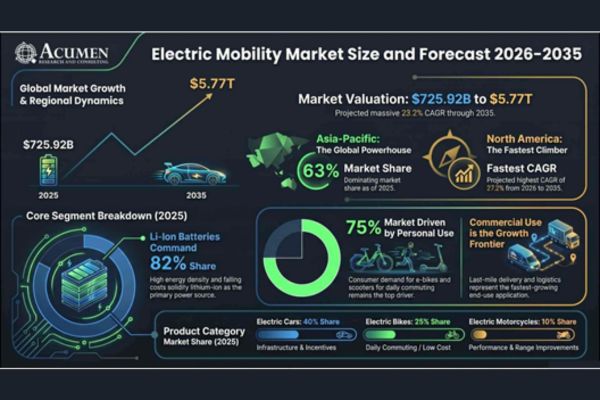 According to Acumen Research And Consulting, the global Electric Mobility Market was valued at USD 725.92 billion in 2025 and is projected to reach USD 5,773.18 billion by 2035, growing at a CAGR of 23.2% from 2026 to 2035. This growth is driven by increasing EV adoption and strong government support.