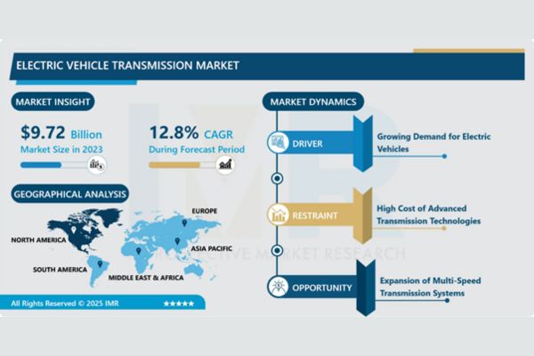 The global Electric Vehicle (EV) Transmission Market is projected to grow from USD 9.72 billion in 2023 to USD 28.74 billion by 2032, expanding at a CAGR of 12.8% during the forecast period. According to Introspective Market Research (IMR), the market is gaining momentum as automakers accelerate EV production, demand rises for drivetrain efficiency optimization, and advanced multi-speed transmission technologies gain traction across passenger and commercial electric vehicles.