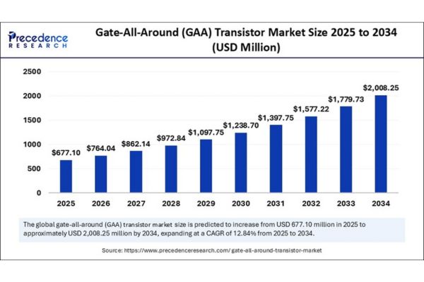 According to Precedence Research, the global Gate-All-Around (GAA) transistor market, valued at USD 677.10 million in 2025, is projected to surge to approximately USD 2,008.25 million by 2034, expanding at a robust CAGR of 12.84% from 2025 to 2034.