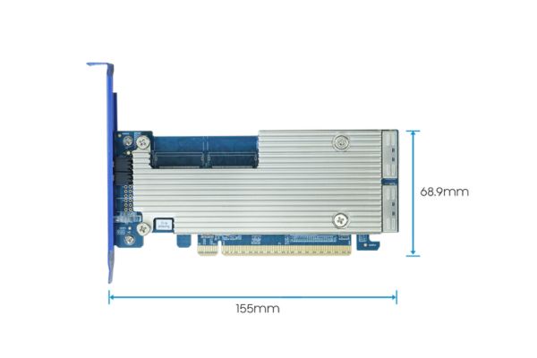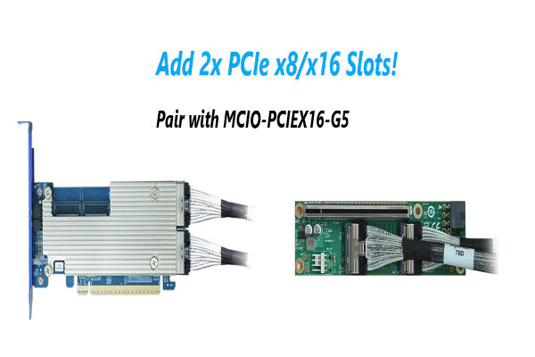Dual MCIO x8 to PCIe x16 expansion bridge card, effectively creating two additional Gen5 x8 or a single x16 slot for GPUs or I/O cards — a gamechanger for compact computing environments.