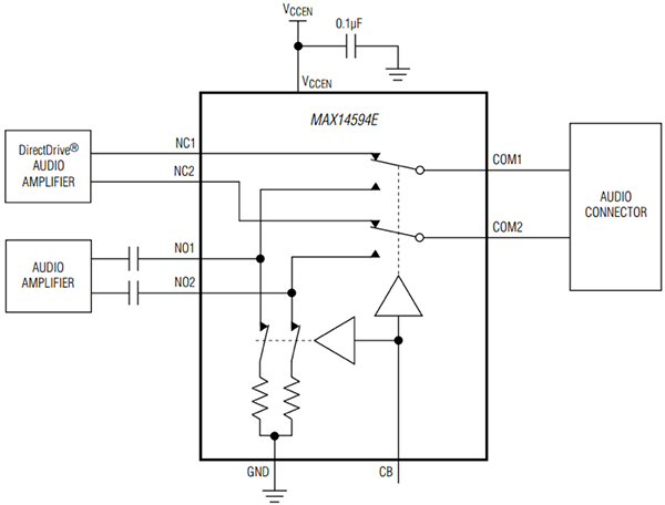 In reference to Figure 3, CB is pulled low to connect NC1 and NC2 to COM1 and COM2, respectively. At the same time, this connects the output of the audio amplifier at NO1 and NO2 to the shunt resistors. When CB is pulled high, NO1 and NO2 are connected to COM1 and COM2, respectively, which also disconnects the shunt resistors.