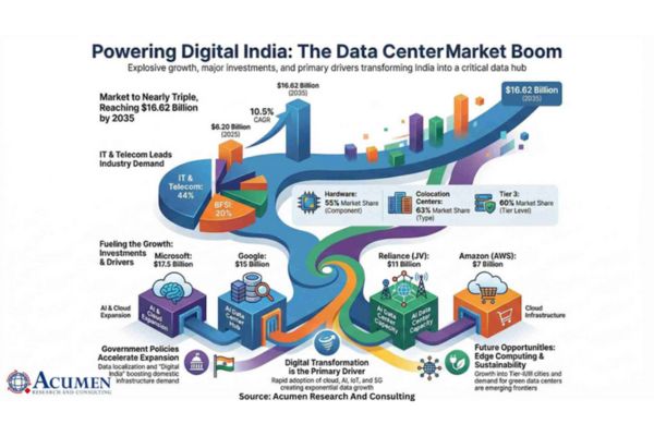 According to Acumen Research and Consulting, the India Data Center Market Size was valued at USD 6.20 billion in 2025 and is projected to expand to USD 16.62 billion by 2035, achieving a compound annual growth rate (CAGR) of 10.5% over the forecast period. These numbers underscore not just quantitative growth, but a transformation in how data is generated, processed, and consumed nationally.