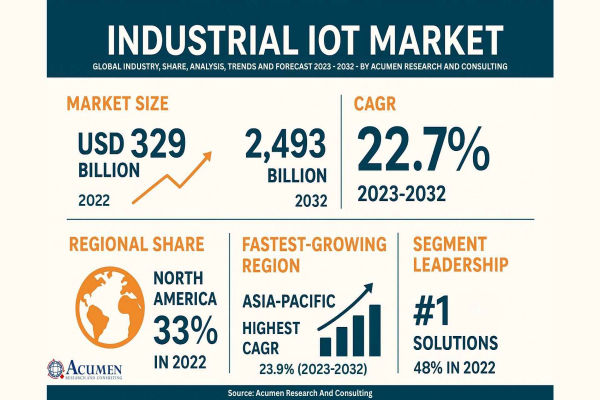 The Industrial IoT Market has fast emerged as the backbone of smart manufacturing, energy, logistics, and utilities. Powering everything from predictive maintenance to real-time analytics, Industrial IoT (IIoT) is not just an idea—it’s a multi-trillion-dollar industrial evolution in motion. According to Acumen Research and Consulting, the Industrial IoT Market Size is expected to escalate from USD 329 billion in 2022 to an astounding USD 2,493 billion by 2032, growing at a formidable CAGR of 22.7% between 2023 and 2032. This monumental growth reflects the technology’s pivotal role in transforming manufacturing, utilities, energy, and logistics on a global scale.