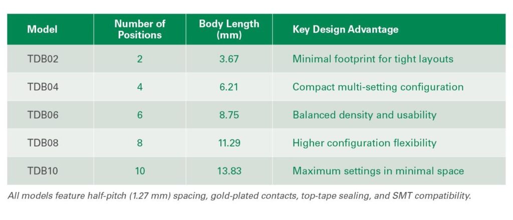 As electronic systems continue to shrink, design engineers face growing challenges fitting configuration and addressing switches into increasingly compact layouts without compromising electrical performance or assembly yield. The TDB Series addresses these challenges by significantly reducing the internal mechanism size, delivering a 1.27 mm half-pitch footprint that enables higher component density while maintaining robust electrical and mechanical reliability.