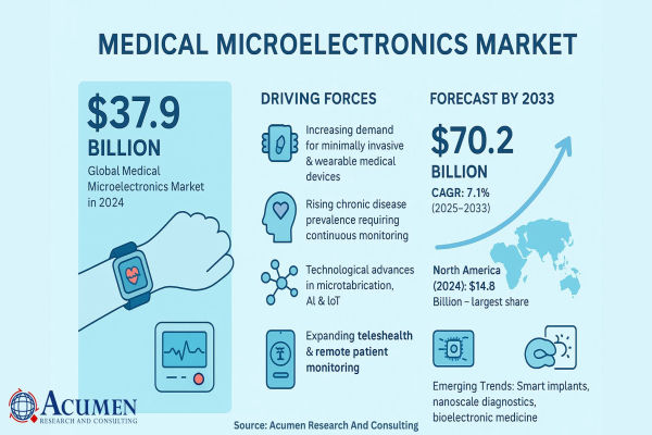 The Medical Microelectronics Market—driven by miniaturized implants, diagnostic wearables, and remote monitoring devices—is growing rapidly. According to Acumen Research & Consulting, this sector is poised to expand from USD 37.9 billion in 2024 to USD 70.2 billion by 2033, with a solid 7.1% CAGR over 2025–2033.