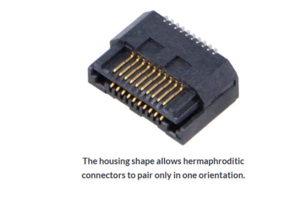 Hermaphroditic connectors have only one type, connected in pairs by rotating 180° relative to each other. Samtec products have an audible latch at the moment of pairing, which additionally strengthens the connection (according to the manufacturer’s data, disconnection requires a force about 6-8 times greater than comparable board-to-board sockets). These solutions belong to LSEM, LSHM, and LSS series with a 0.5mm pitch, containing from 20 to 100 contacts with a current capacity of up to 2A. Depending on the model, the connection has a height of 5mm, 8mm, or 12mm.