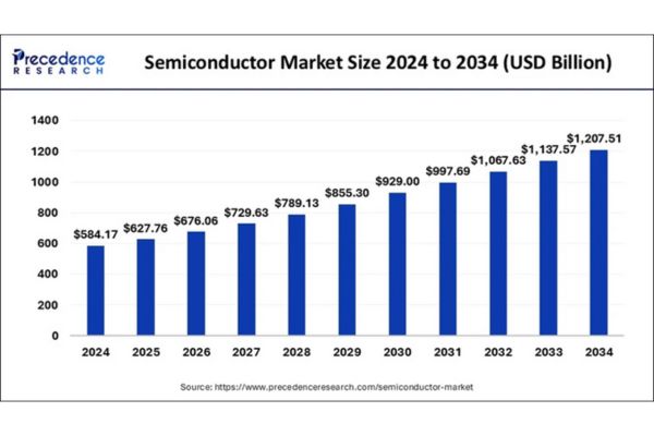The global semiconductor market size is evaluated at USD 627.76 billion in 2025 and is predicted to be worth around USD 1,207.51 billion by 2034, growing at a CAGR of 7.54% from 2025 to 2034. This reflects the increasing demand for advanced electronics, AI chips, cloud infrastructure, and smart devices. Over the next decade.