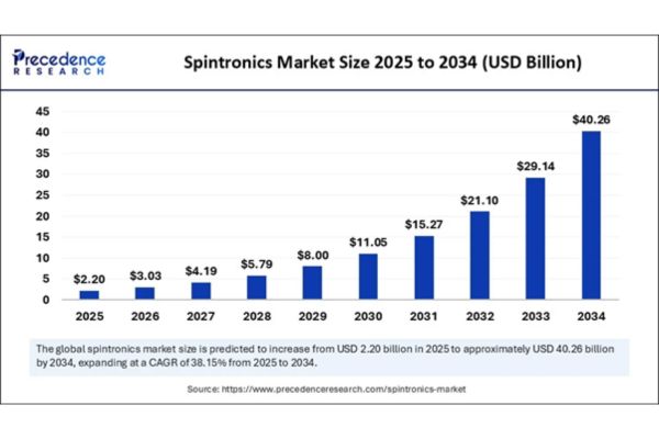 According to Precedence Research, the global spintronics market size was valued at USD 1.59 billion in 2024 and is projected to reach around USD 40.26 billion by 2034, growing at a CAGR of 38.15%.