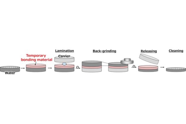 In back-grinding, engineers fix a wafer to a carrier substrate (note 4), grind it down, and then peel the thinned wafer from the substrate. This process relies on a temporary bonding material used in back-end steps (note 5).