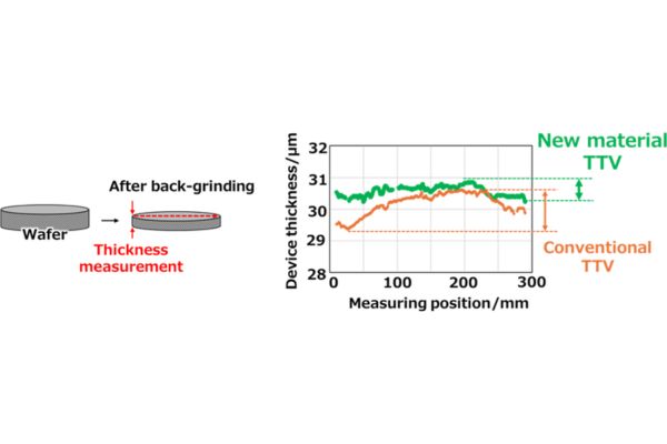The elastic modulus of Toray’s new material is 2.5 times higher than that of its conventional counterpart. It suppresses the deformation of semiconductor process materials during back-grinding (see note 2) and evenly distributes pressure across the wafer surface. The company thus reduced the total wafer thickness variation (see note 3) after thinning to below 1.0 micrometer.