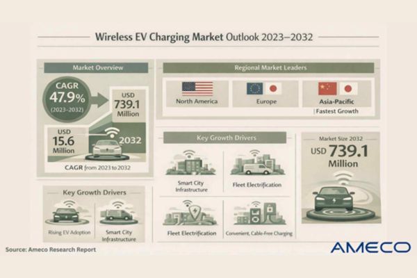 According to Ameco Research, the Global Wireless EV Charging Market was valued at USD 15.6 million in 2022 and is projected to reach USD 739.1 million by 2032, expanding at a compound annual growth rate (CAGR) of 47.9% from 2023 to 2032. This rapid growth reflects a fundamental shift toward automation, convenience, and sustainability in EV infrastructure.
